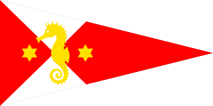 The pennant is horizontally parted of wite over blue. Shifted to hoist is a logo, a blue sailing ship over blue waves, surrounded by a blue annulet charged with the name in white initials.
