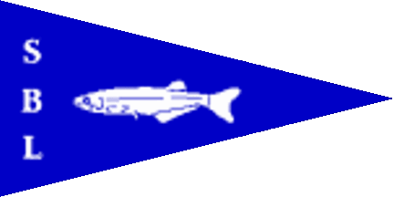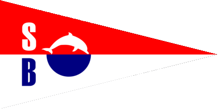 The pennant is white parted by a blue horizontal line, in upper hoist are blue initials "SB", in lower hoist two blue waves in pale.