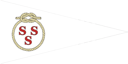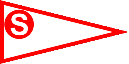The pennant is white. Shifted to hoist are three red initials "S" ordered 2:1, surrounded by a yellow rope with square knot at its top.