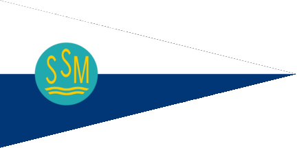 The pennant is horizontally parted of white over blue. Shifted to hoist is a greenish blue disc with yellow inscription "SS(higher)M" over yellow waves.
