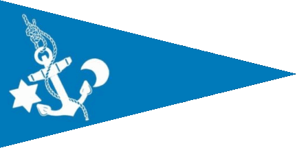 The pennant is blue. At hoist is a white fowl anchor in bend, flanked at hoit by a white 6-point star and at fly by a white crescent.