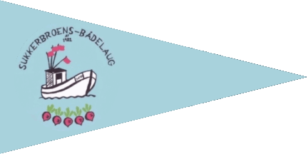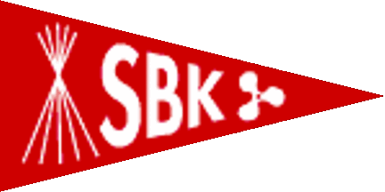 The pennant is dark red with white converging inscription "SBK", probably the old name, flanked at fly by a white ship propeller and at hoist by a white bundle of tent poles.