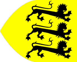 with a black lion passant (facing the hoist) with both forepaws raised (though