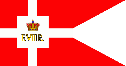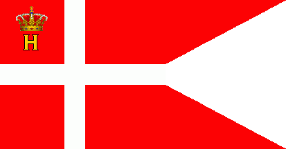 As long as run by the Danish state the port had a state ensign defaced with golden letters "HF. VIII R." under a royal crown on a white square in centre of the flag.