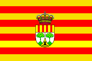 "Nine-striped flag, alternating yellow and red, with the municipal coat of arms in the center of the cloth. Adopted by the Royal Academy of History at its meeting of 23 November 1990."