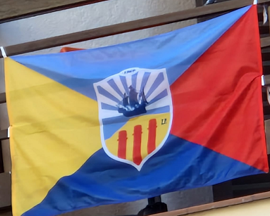 Today near of my home, in the famous beach-city of Salou from where our King James I sailed to conquer the Balearic islands, my daugther saw this flag in a balcony that we could not identify.