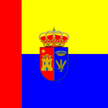 Flag: Tricolor flag with scale 10:10. Along the hoist a vertical stripe of 0.2 red, the rest of the flag made of two horizontal stripes (0.8 x 0.5), the upper stripe yellow and the lower stripe blue. In the middle of the flag is placed the municipal coat of arms.