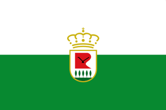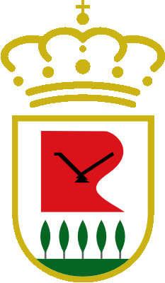 Coat of arms: Spanish shield. Argent A R-shaped figure gules charged with a plough sable fimbriated argent in base five poplars vert with trunk proper on a terrace vert. The shield surmounted by a Royal Spanish crown closed.