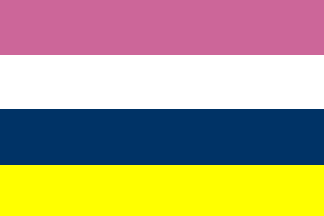 Horizontally striped purple-white-blue-yellow. Colours from the coat-of-arms, apparently the higher the stripe the more frequent the tincture on the arms. Ratio 2:3. Flag adopted 26th November 1999. Source for image and text: Fluvià 2001.