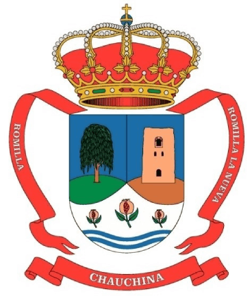 Description: Per pale and enté en point. First, azure, a willow proper, on a terrace vert. Second, azure, a tower proper, on a terrace of the same. Enté en point, argent, three pomegranates or, seeded gules, stalked and left vert, placed fesswise; in base, waves azure and argent. Crest: a closed royal crown. Flanked by a ribbon gules with the inscription, on the dexter side, ROMILLA, and on the sinister side, ROMILLA LA NUEVA. Below the base, another ribbon gules with the inscription CHAUCHI NA.