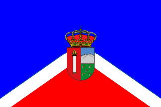 Flag: Rectangular in proportions 2:3. Made of a blue panel with a red isosceles triangle placed along its lower edge, the vertex reaching the center of the panel. Running from the ends of the lower edge, two white stripes converging to the center of the panel. All over, centered, the coat of arms of the municipality.