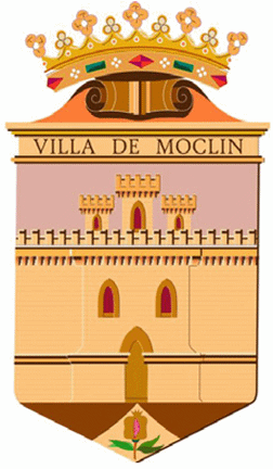 Description: The coat of arms used by the Town Hall depicts a castle with three towers, flanked by a wall, and topped with a pomegranate. At the top is the inscription "Villa de Moclín". The crest is an open royal crown. The shield lacks any recognizable enamels.