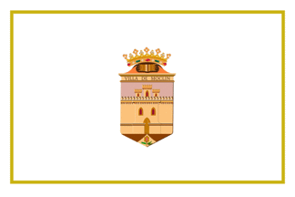 Description: White cloth with a thin gold stripe along the entire perimeter, but separated from the edges. In the center, the municipal coat of arms.