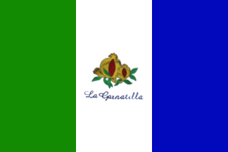 The flag of La Garnatilla (photo, photo), which does not seem to have been officially registered, is vertically divided green-white-blue. In the flag's center are placed two pomegranates of unequal size, with green leaves. Beneath appears the village's name, in blue cursive letters.