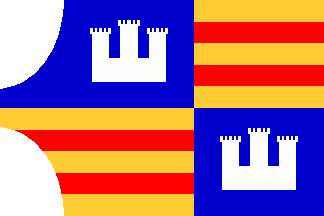 The flag is the Aragonese-Catalan flag - nine horizontal stripes yellow and red - with, along the hoist, a white castle rotated 90º counterclockwise on a purple field. On the central tower, an angel in black, haloed and holding a stick topped by a cross.