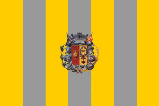 Flag: Rectangular flag, with usual proportions of the length 3/2 the hoist, with seven vertical stripes: four gold and three silver, of equal size, in turn gold and argent, with golden stripes at hoist and fly; charged with the crowned coat of arms of the town, the geometric axis of the shield matching the center of the flag, with a height of 2/5 the flag's hoist, the shield represented on both sides of the flag.