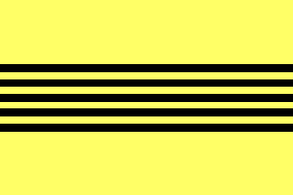 A yellow flag with five thin black horizontal stripes in the central horizontal third of the flag. Colours from the arms, which show a gold bee (Catalan abella) on a black field, as it appears in the city webpage.