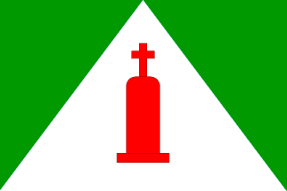 Flag: Rectangular flag with proportions 2:3, made of a green panel with a white triangle whose vertices are the lower fly and hoist and the midpoint of the upper edge of the flag, charged with a red pillory.
