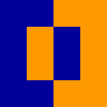 Dov Gutterman reported the flag of Quel in this website. Quel has a square flag with a blue hoist and an orange fly, with a central counterchanged square. The image in the website certainly shows a very orange shade, even if it might be actually yellow, since the flag appears to be based on the coat-of-arms whose blazon is per pale Azure and Or, a castle counterchanged.