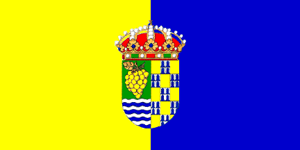 The flag of Tudelilla is vertically divided yellow-blue with the municipal arms in the middle. The arms of Tudelilla are "un campo de sinople con ondas de azur y plata puestas en punta, surmontadas de un racimo de uvas de oro, tallado y hojado y presenta, además, un jaquelado de quince piezas, de las que ocho son de oro y siete piezas son de veros;" per pale first vert a grape wavy azure and argent in base second chequered fifteen pieces or and vair.
