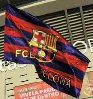 A variant of the "FC BARCELONA" soccer/football flag with the team's name inscribed on the bottom two stripes, as seen at the Metropolitano stadium in Madrid, c. March 2024. Credit: Isabel Infantes/Reuters.