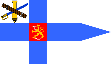 Three-tongued national flag with square coat-of-arms in the center of the cross and special emblem in canton: a vertical yellow cannon barrel defaced by a sword and fasces (?) in saltire (almost the same as the Commander of the Defense Forces (sotaväenpäällikkö) until 1938 but coat-of-arms without yellow border and roses, and fasces placed on top of the sword).