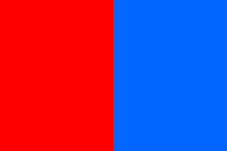 The flag used by the supporter's club of SM Caen (MNK 96 - Malherbe Normandy Kop 96) is vertically divided red-blue with the club's emblem in the middle (photo).
