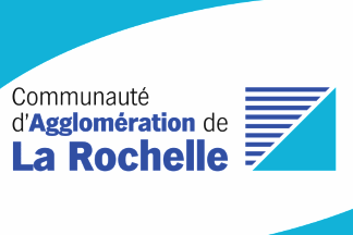 The flag of the Communauté d'agglomération de La Rochelle (photo) is white with the logo of the authority and sky blue corners at upper hoist and lower fly, as if the logo was surrounded by an ellipse.