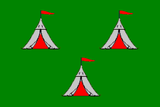 The flag of La Châtre (photo, photo) is a banner of the the municipal arms, "Vert, three pavilions argent surmounted by three pennants gules". On the flag, the pavilions are grey, they are open and the inside is red.