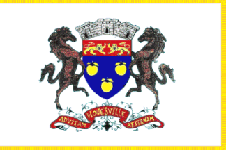 The flag of Houesville (photo) is white with a golden fringe, charged in the center with the municipal coat of arms, "Azure three apples or a chief gules two leopards or", supported by two horses, surmounted by a mural crown argent and surmounting a scroll gules inscribed with the Latin motto "Ad vitam aeternam" or, crown). THe municipality also uses, reportedly, a banner of the arms.