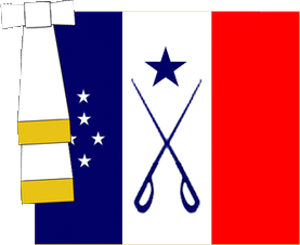 The flag of the Chief of the Defence Staff (Chef d'État-Major des Armées, CEMA) is a square tricolour flag with two blue swords crossed in saltire in the center of the white stripe, surmounted by a five-pointed blue star. [Album des Pavillons [pay00]]