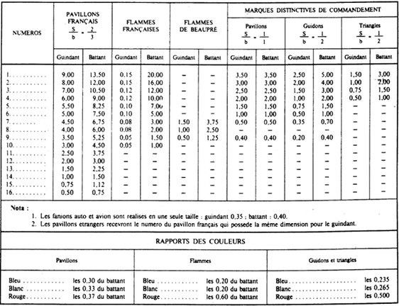 1. Size of each model number for ensigns (pavillons français), masthead pennants (flammes françaises) lanyard pennants (flammes de beaupré or de fourragère), rank pennants (marques distinctives de commandement).