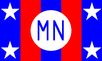The house Flag of Société (Nantaise et) Morbihannaise de Navigation is made of five vertical blue-red-blue-red-blue stripes, with two white stars placed vertically in the first and the last blue stripes and a white disk charged with the blue letters "MN" in the middle.