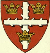 Blazon: "Gules a cross raguly, couped proper, the arms joined in fylfot, between two ducal coronets in chief or the bottom part of the cross enfiled with a ducal coronet of the last, beneath each coronet a nail of the first, that in base piercing the cross."