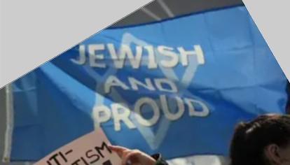 A light-blue-field flag with a "JEWISH AND PROUD" slogan superimposed on a faint white "Star of David" or "Mogen David" in the middle, as seen at a "Campaign Against Antisemitism" rally at a "Chabad Lubavitch UK" event in Westminster, central London, UK; c. 16 Dec. 2025; (Photo credit: Pic PA). "Chabad Lubavitch UK" is the British branch of the global "Chabad-Lubavitch Hasidic movement", serving as an educational and outreach organization that provides an inclusive hub for Jewish life, learning, and community services across the UK.