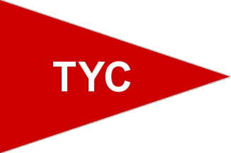 Pennant: circa 5:6 (print image). Red field charged by the white capital letters TYC.
