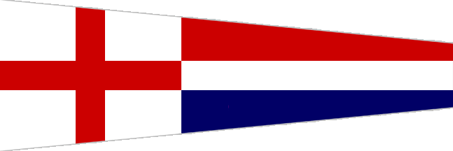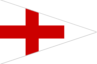 Pennant circa 5:6 (print image). White field superimposed by a red St. George's cross, centred 2 units from hoist (horizontal arm 4 units and vertical arm 3 units).