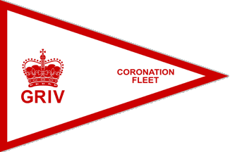 Pennant circa 5:6 (print image). White field fimbriated red on three sides charged (towards the hoist) by a red crown above the red letters GRIV and (towards the fly point) the word