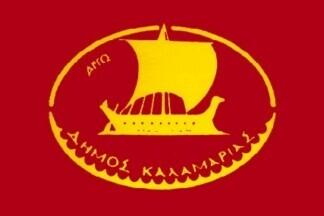 The flag of Kalamaria (municipal website) is white with "Argo", the ship of Jason and the Argonauts. The ship "writes" ΔΗΜΟΣ ΚΑΛΑΜΑΡΙΑΣ (Municipality of Kalamaria) above the sea waves.