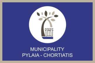 The flag of Pylaia-Chortiatis (photo) is blue with a light grey border, the municipality's emblem in a white disk and its name below.