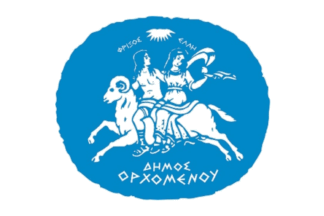 There are two flag variants of Orchomenos, both showing an emblem with two men riding a goat, one in blue, one in brown.