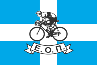 The flag of the Hellenic Cycling Federation is a white cross on a blue field with the federation's emblem