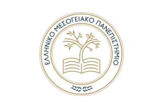 The flags of the Hellenic Mediterranean University are white or dark blue with the logo in