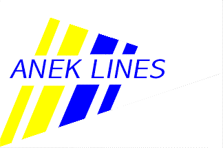 Companies of the World (1995) [lgr95], the house flag of ANEK is a white burgee with in the center a white horizontal stripe charged with "ANEK LINES" in blue and slanting vertical blue and yellow lines. The funnel shows a blue map of Crete.