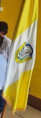 The flag of the Municipality of Tucuru is horizontal with three vertical stripes of yellow, white and yellow with newly updated municipal emblem in the middle of the white stripe.