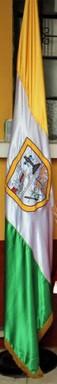 The current flag of the Municipality of Santa Cruz Verapaz is horizontal with three vertical stripes of orange, white and green with municipal coat of arms in the middle of the white stripe