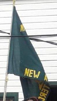 The town council flag appears to be a green field which reads (in gold letters) curved above: "MAYOR & TOWN COUNCIL OF"; below "NEW AMSTERDAM".