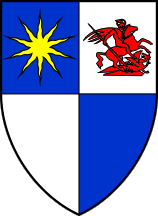 The coat of arms pictures in a blue shield St. George slaying the dragon standing on a green hill.