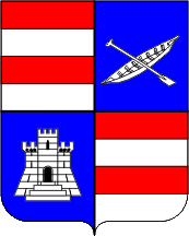 The coat of arms is "Quarterly, 1. and 4. Barry of four gules and argent (together giving eight bars representing the historical arms of Dubrovnik), 2. Azure a trupica with an oar argent (a trupica is a traditional small boat used by people of the Neretva delta), 3. Azure towers argent ("towers" being here a composition of several towers typical of the town of Korčula, on the island of the same name). The (fimbriation) line bordering, lining and dividing the elements of the shield is prescribed black.