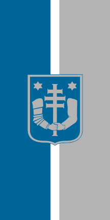 - The third design (photo, 2015) is a vertical rectangular flag with the coat of arms from the 1990s set in the bottom above a two lined inscription of the town's name, all in silver/gray.
